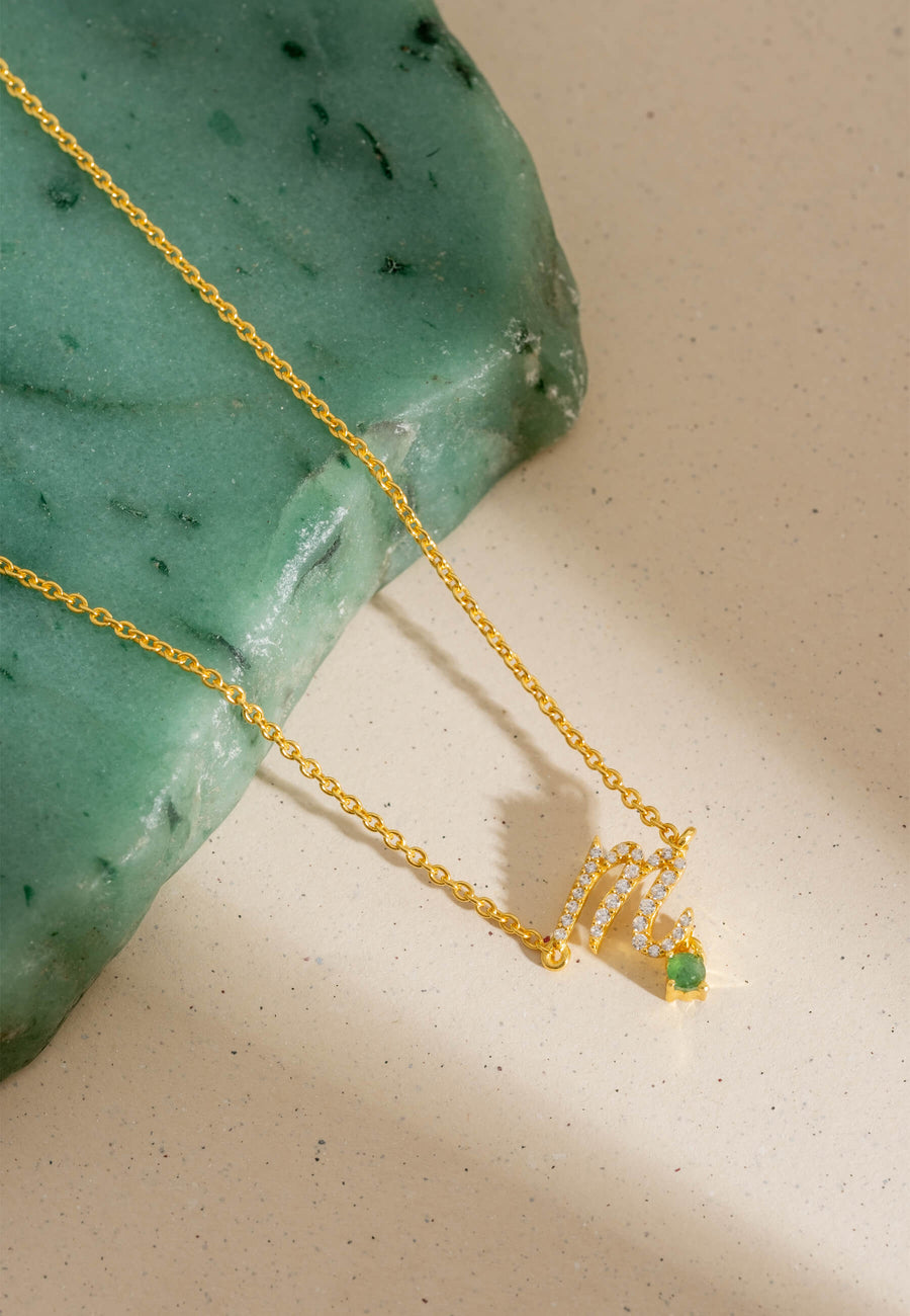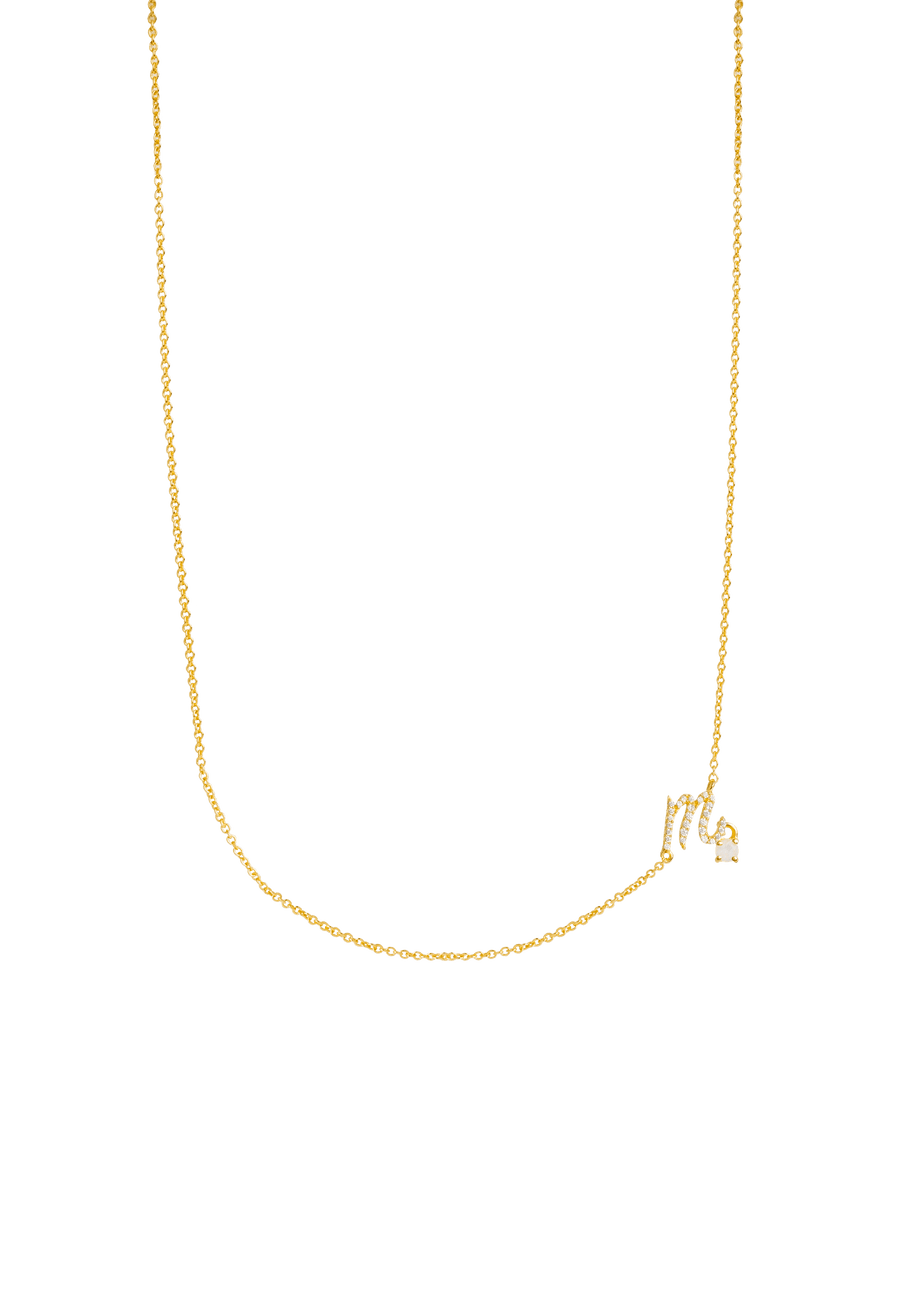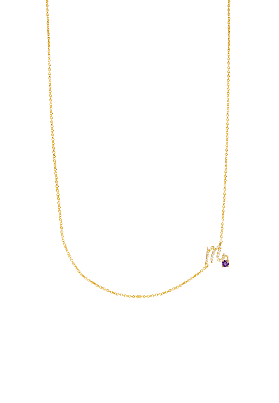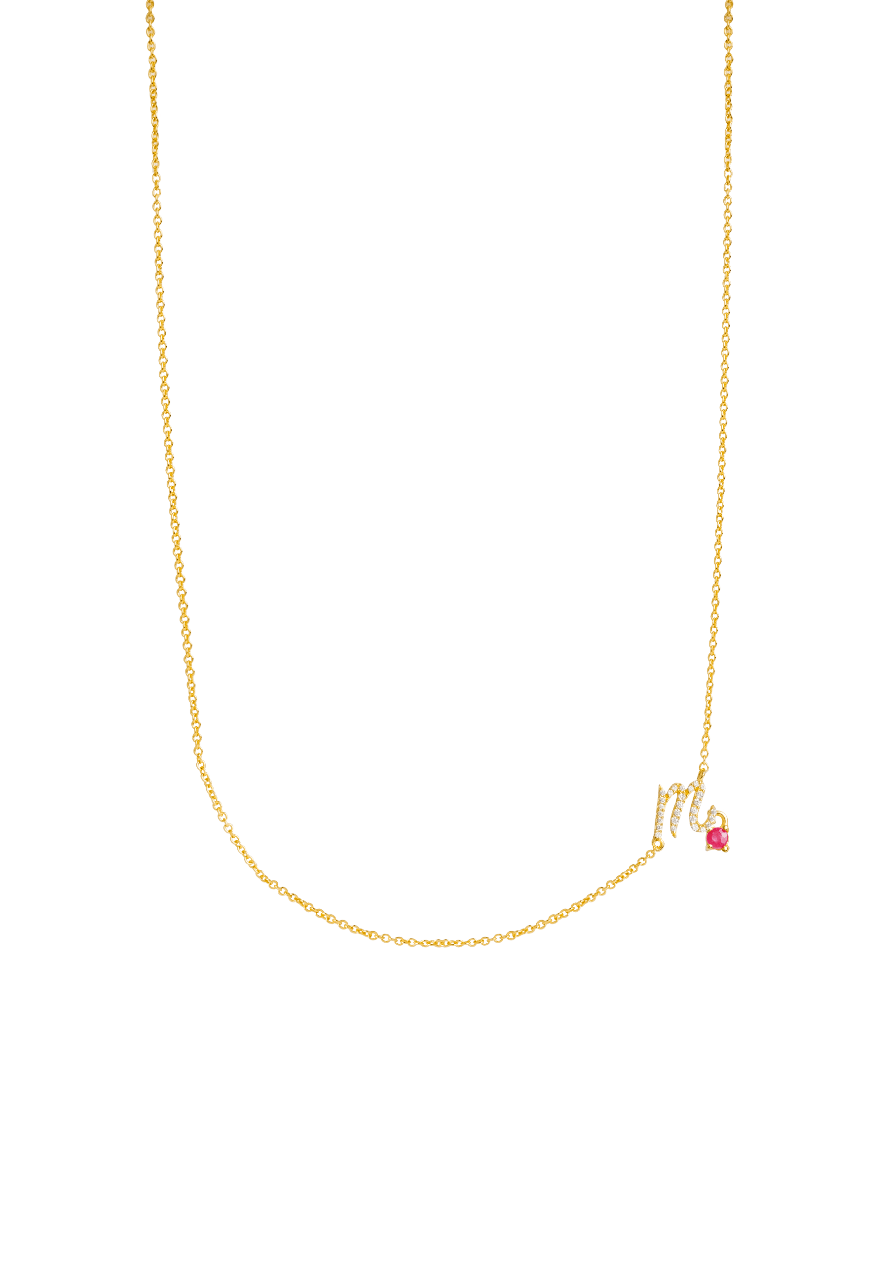 Discover your new Initial M necklace decorated with white zircons and with the birthstone of your choice. A very special initial M necklace thanks to its design interspersed in the chain and with the mystical and different touch of the birthstones of each month.