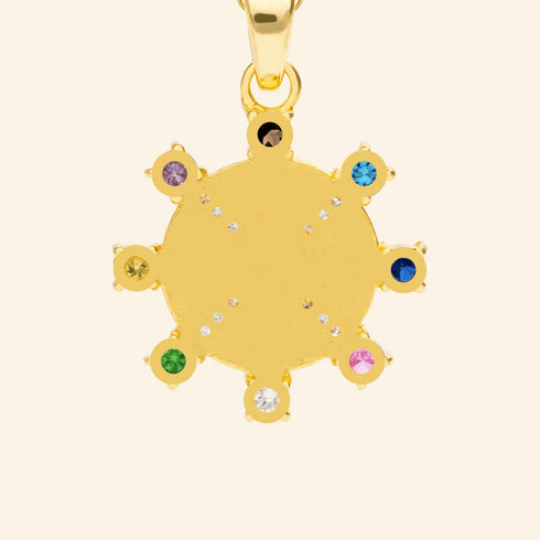 Collar Rueda de la Fortuna dorado con piedras de colores.